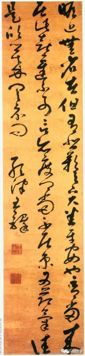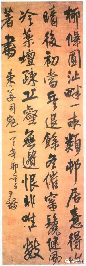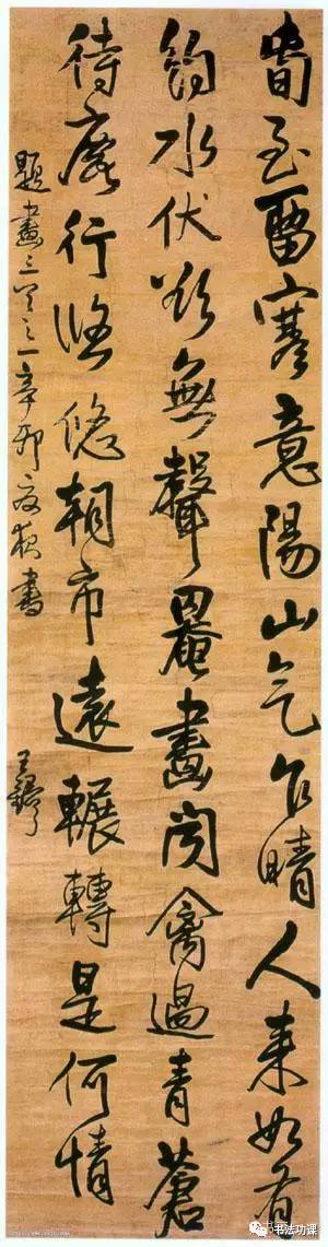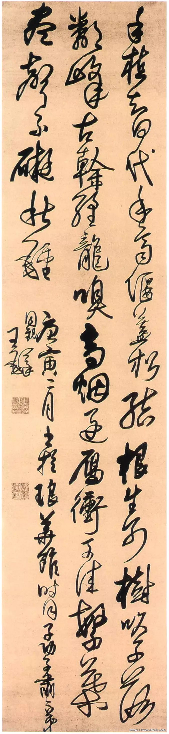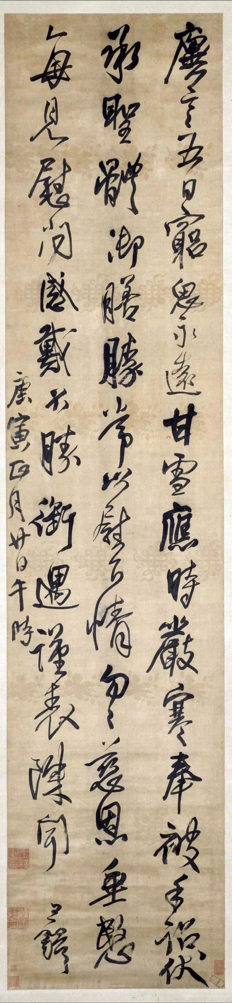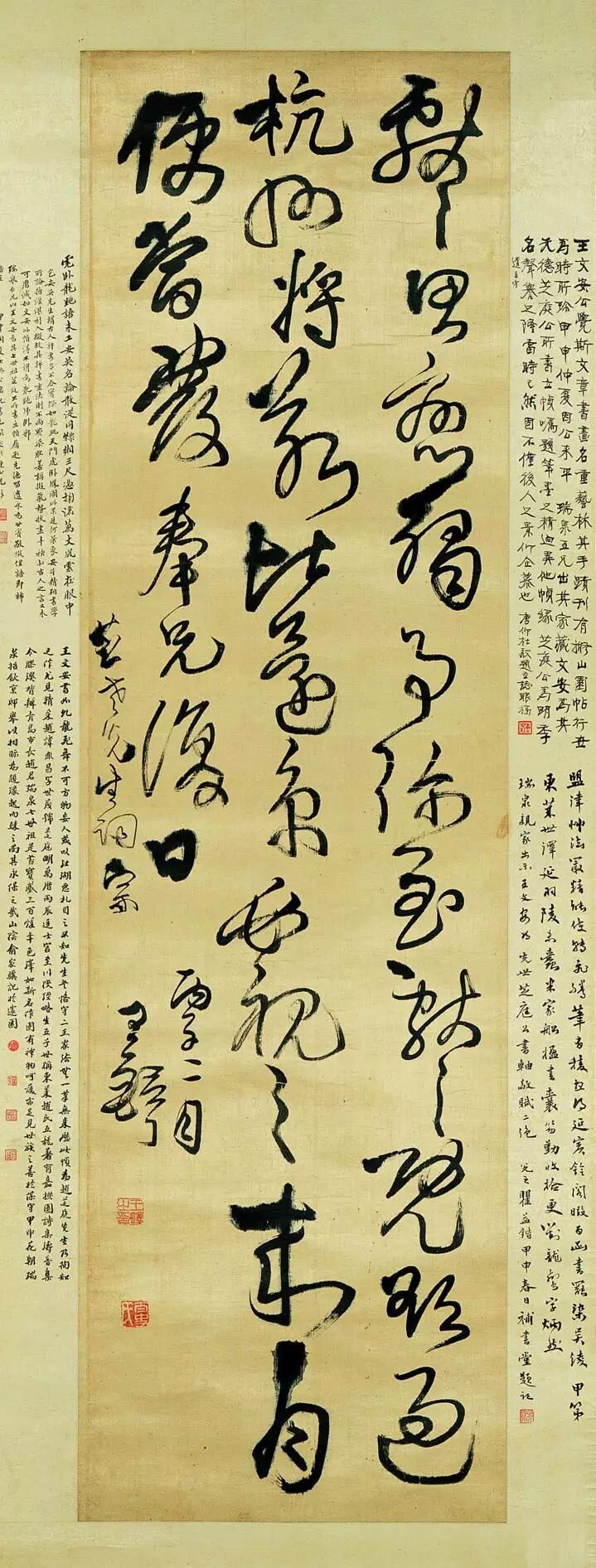 王铎《临王羲之帖》自署书于庚寅年(清顺治七年,1650年)。草书。绫本。凡三行,共66宇。纵240cm,横51cm。开封市博物馆藏。
