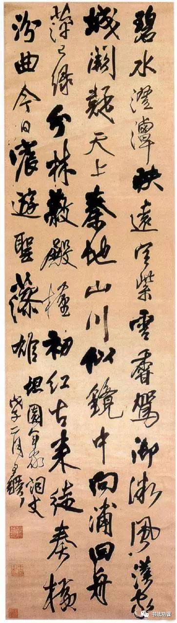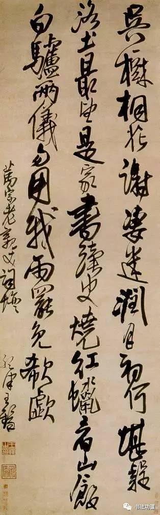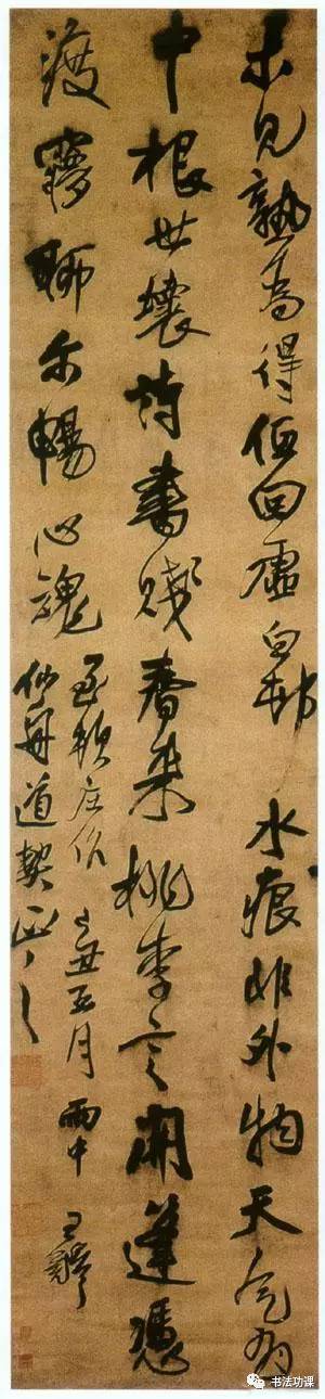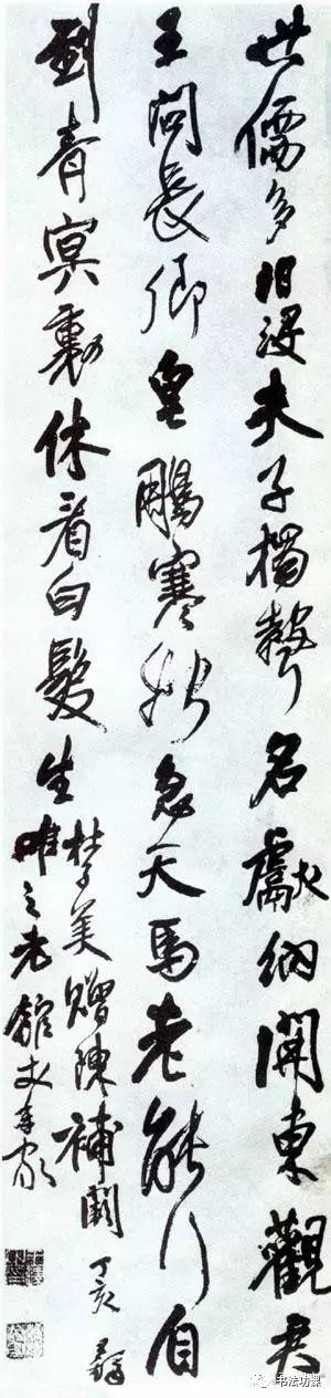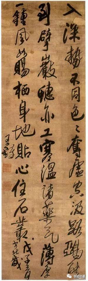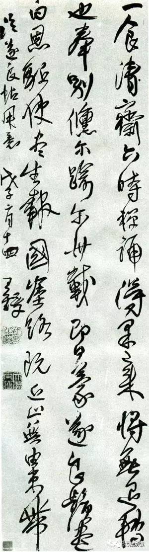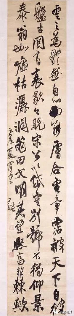 大凡一个大书家的条件中,所有有形的笔墨技法,都已经是属于形而下的问题了,但这些要件,却又是主宰著表现的基本要素,王铎这件条幅作品,是五十岁壮年写的,当属他成熟而精神状态极佳的时期。
