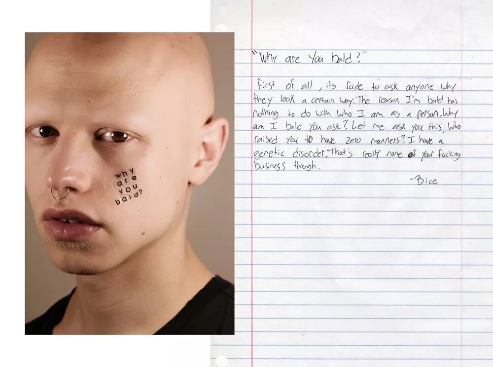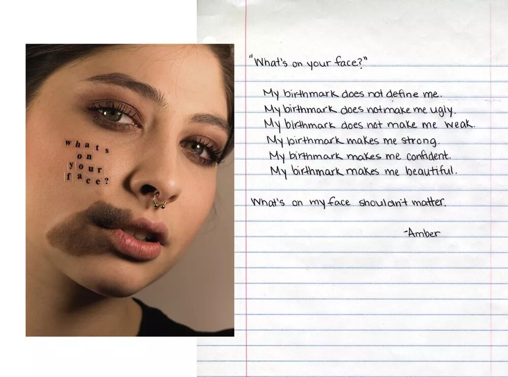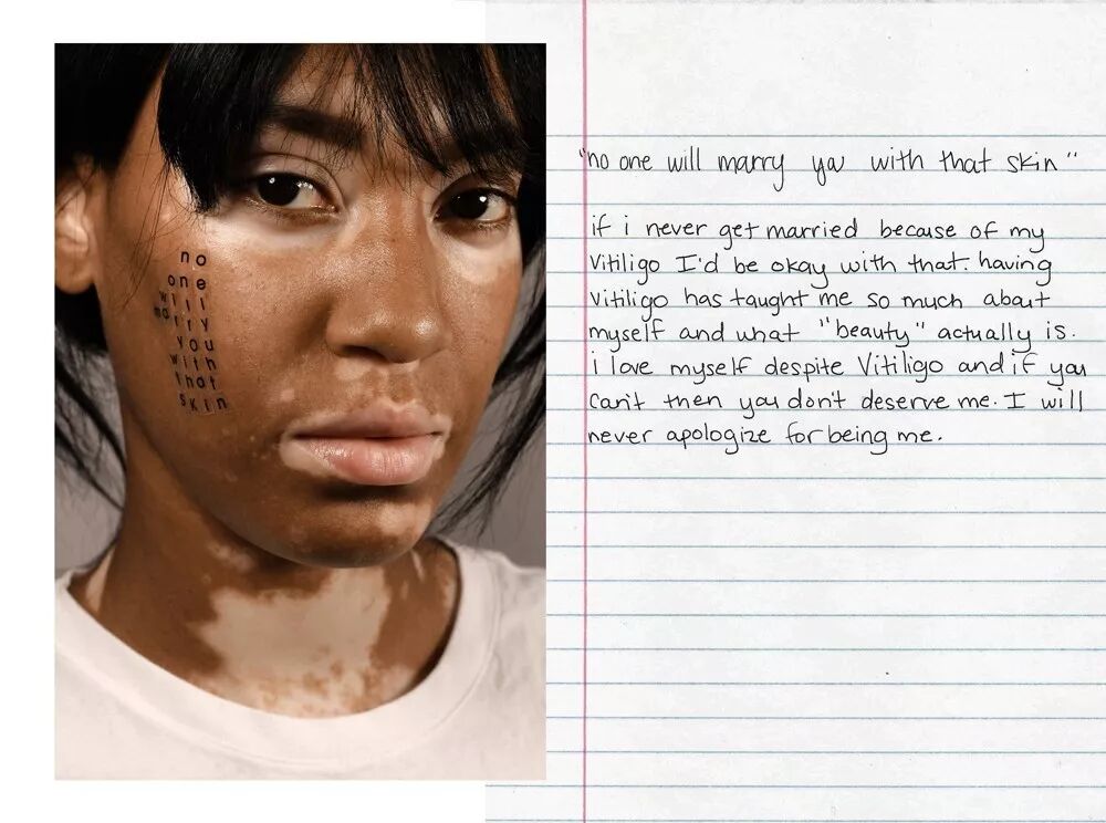 每张close-up旁边都附上当事人亲笔书写的内容,讲述了过去因外观碰到过的种种痛苦经历,到逐渐学会悦纳自我的转变。他们内心承受过多大的起伏和挣扎,我们无从得知,但这个演化过程,绝不容易。