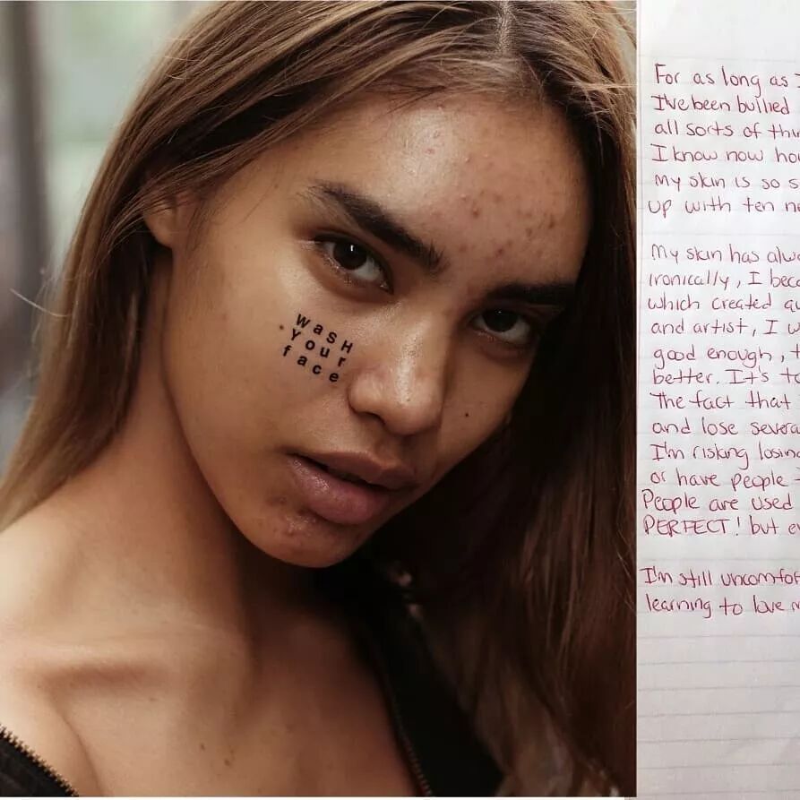 Peter终于受够了 “精致” ”无瑕” 的时尚大片,于是,他选择站出来,发起了一个为痘痘肌人群正名的拍摄项目。他开始寻找和自己有相似经历的人当模特,为他们拍肖像。随后,在没有经过Photoshop修饰处理的前提下,把这些照片发布到Instagram,并带上有趣的标签,其中既有 #AcneIsNormal #LoveYourself 等鼓舞人心的语句,也有#WashYourFace #DrinkWater 这一类路人妄加在他们身上的偏见。