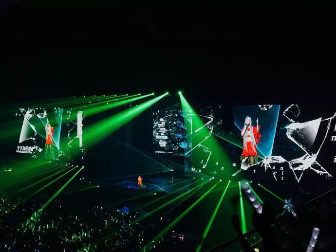 LED透明屏的应用,让她的乌托邦2.0舞台风格更梦幻、酷炫,透光性强的特性,让灯光与画面融为了一体。而超过864平方米,相当于两座多篮球场面积的舞台LED量,视觉感惊人。手机横拍都不能囊括全画面的主横屏上是她海报中的锐利眼神,的确瞬间进入新的国度。