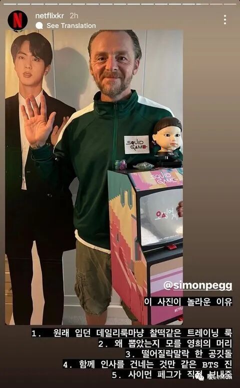 近日,《鱿鱼游戏》赠送周边商品给好莱坞演员身兼制作人的席蒙珮吉(Simon Pegg),没想到他不仅穿上参赛者的绿色运动外套,还开心的和后方的