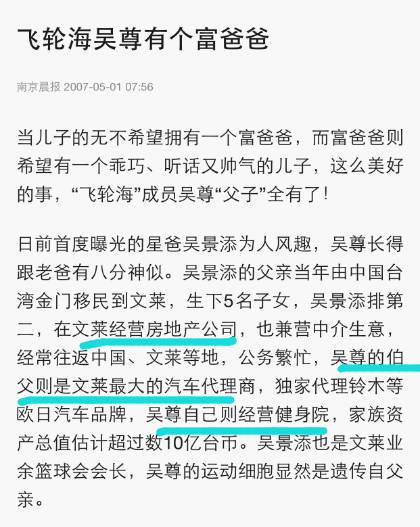 自己出生在富贵之家,早在2007年的时候就有新闻报道,说吴尊父亲做地产,自己伯父做代理,总之不是属于会为钱犯愁的人。