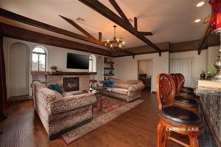 住宅的整个二楼都是专属的私人主卧空间,甚至还包含带吧台的待客空间、豹纹沙发和壁炉。
