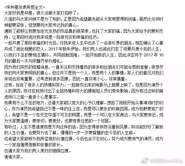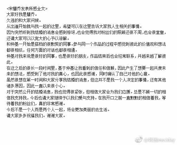 昨天双宋夫妇公开婚讯后,两人分别通过FanCafe公开了结婚感言,以下为两人发表的所感全文。