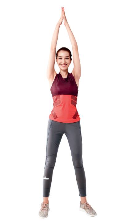 双脚并拢,双手自然放在身体两侧,双脚跳跃分开至与肩同宽,同时双手向上伸展至最高点击掌;