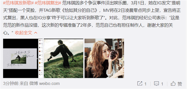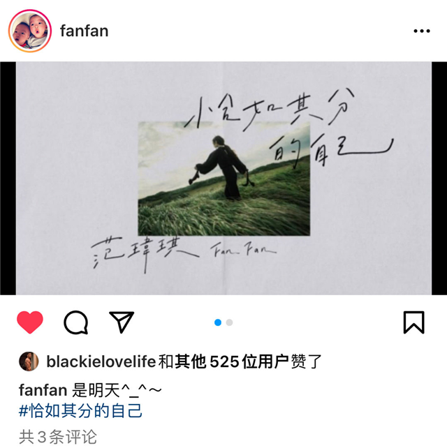 范玮琪在社交网站上发文:是明天,再配上了一个简单的笑脸。其实是范玮琪将在明天发布新歌《恰如其分的自己》,这首歌的MV也将在3月2日凌晨零点同步上架。通过一首新歌,范玮琪宣布自己的正式复出,老公陈建州也在社交账号上分享:终于可以让大家听到新歌了。