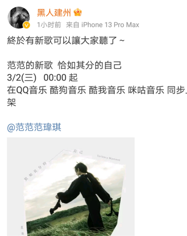 其实在今天之前,范玮琪的丈夫陈建州就曾在微博发布预告。2月22日的时候,陈建州在微博上发文称:好的音乐值得等待。配图是一张范玮琪正在录音室的照片,4天后,陈建州又发布了一条动态:感动的音乐,值得等待,配图依旧是范玮琪在录音房录歌的场景。直到今天范玮琪的新歌发布,陈建州又发了一条动态,他还发布了新歌上线的平台。这连续三条动态,陈建州都艾特了范玮琪的微博账号,只是范玮琪并没有任何的回应。