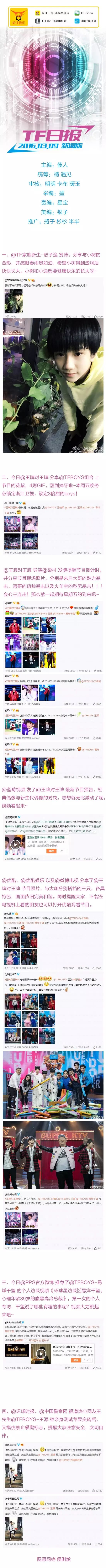 『TFBOYS』TF日报 -不负责任组>>2016<<0309期 TF日报不负责任组 内地男星 2016-03-10 22:58:29 555 创作不易,用心坚持,欢迎请BaGua喝几杯爱心咖啡!打赏并支持本文 打赏并删除本文 #TFBOYS# #TF日报(不负责任组)# 【2016/03/09】《王牌对王牌》发出@TFBOYS组合 预告连连看,三个宝宝甜掉牙啦!!!超期待周五看到帅气满分可爱满分魅力值满分的boys!!小逸发博po出和小树苗合照,一起长高高!! 创作不易,用心坚持,欢迎请BaGua喝几杯爱心咖啡!打赏并支持本文 打赏并删除本文 感谢您的支持鼓励,我会继续努力的!文章地址:用户邮箱:打赏金额:USDT 请输入数字点击”去打赏“,即可进行打赏支持本文章哦 tfboys About the Author TF日报不负责任组 功能介绍:微博@TF日报-不负责任组 每日一报★投稿邮箱: [email protected] 因为关注,所以疯狂(划掉,差评)高冷. Related Posts 『TFBOYS』TF日报 -不负责任组>>2018<<1206 2018-12-07 18:49:11 『TFBOYS』TF日报 -不负责任组>>2016<<0609期 2016-06-10 12:48:01 TFBOYS』TF日报 -不负责任组>>2016<<0602期 2016-06-03 10:09:35 『TFBOYS』TF日报 -不负责任组>>2016<<0418期 2016-04-19 13:08:22 『TFBOYS』TF日报 -不负责任组>>2016<<0405期 2016-04-06 12:22:42 发表评论
