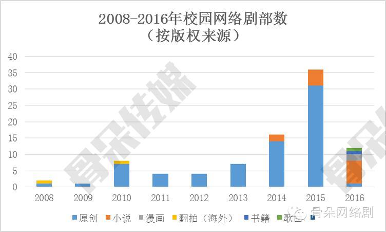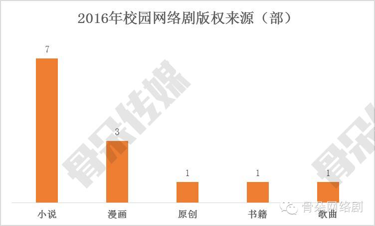 2016年校园网络剧中,原创剧的占比大幅度压缩,仅有1部。另外,除小说与漫画两大来源之外,还新出现了歌曲等IP剧形式。