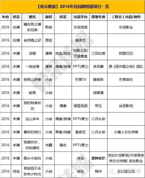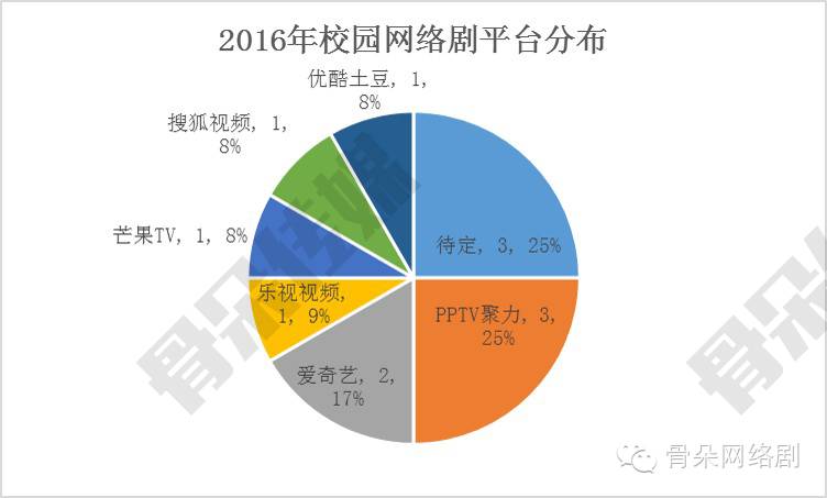 2016年,根据骨朵传媒收集的信息,在已知的12个校园网络剧项目中,PPTV聚力、爱奇艺投入最多,其余乐视视频、芒果TV、搜狐视频、优酷土豆各有一部,参与校园网络剧的平台又有扩展。