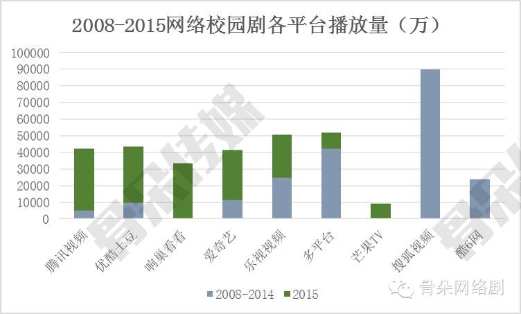 从平台来看,搜狐视频曾经是2014年校园网络剧的强者,2015年则江山代有才人出,腾讯视频、优酷土豆、响巢看看、爱奇艺成为校园网络剧播放量的四强,芒果TV也加入战局。