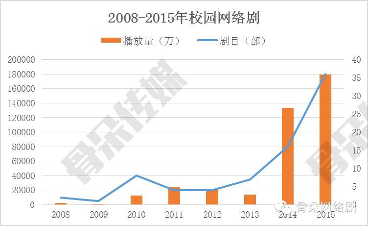 2015年,全网共有校园网络剧36部,比2014年增加了125%,网播量共计 17.9亿,增长34.5%,增量迅猛。