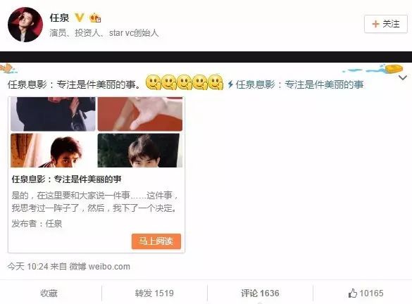 宣布息影的同时,他还写了一小句话:“专注是件美丽的事”。