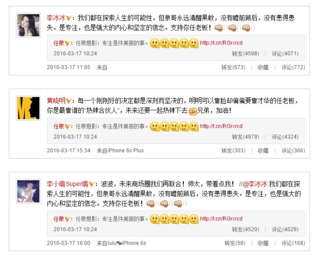 随后,好友李冰冰、黄晓明等圈内好友纷纷表示支持:“泉哥永远清醒果敢,没有瞻前顾后,没有患得患失……支持你任老板!”
