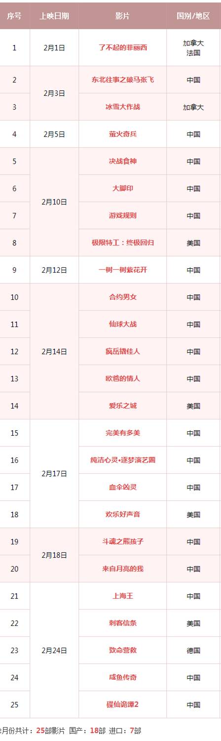 2月11日是中国的元宵节,2月14日是西方的情人节,所以2月影市的主旋律必然是爱情电影。除了原定年初一上映、最后改档2月10日上映的《决战食神》之外,2月14日还有两部风格迥异的纯正爱情片上映,一部是郑秀文和张孝全演绎的浪漫爱情喜剧《合约男女》,另一部是“小岳岳”岳云鹏联手袁姗姗出演的《疯岳撬佳人》。2月17日还有姜武和蒋勤勤主演的奇幻爱情片《完美有多美》。最重头的爱情片必然是2月14日上映的《爱乐之城》,这部好莱坞电影刚获得14项奥斯卡奖提名。