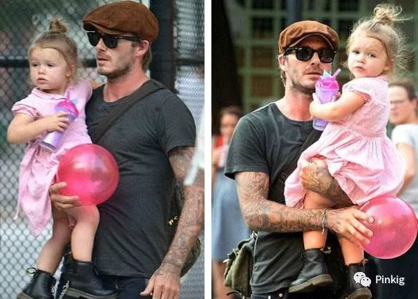 时尚得从娃娃抓起,这句话没毛病。丸子头+公主裙=当日出行的主题:粉红小七的黑马丁和超级奶爸汉姆。