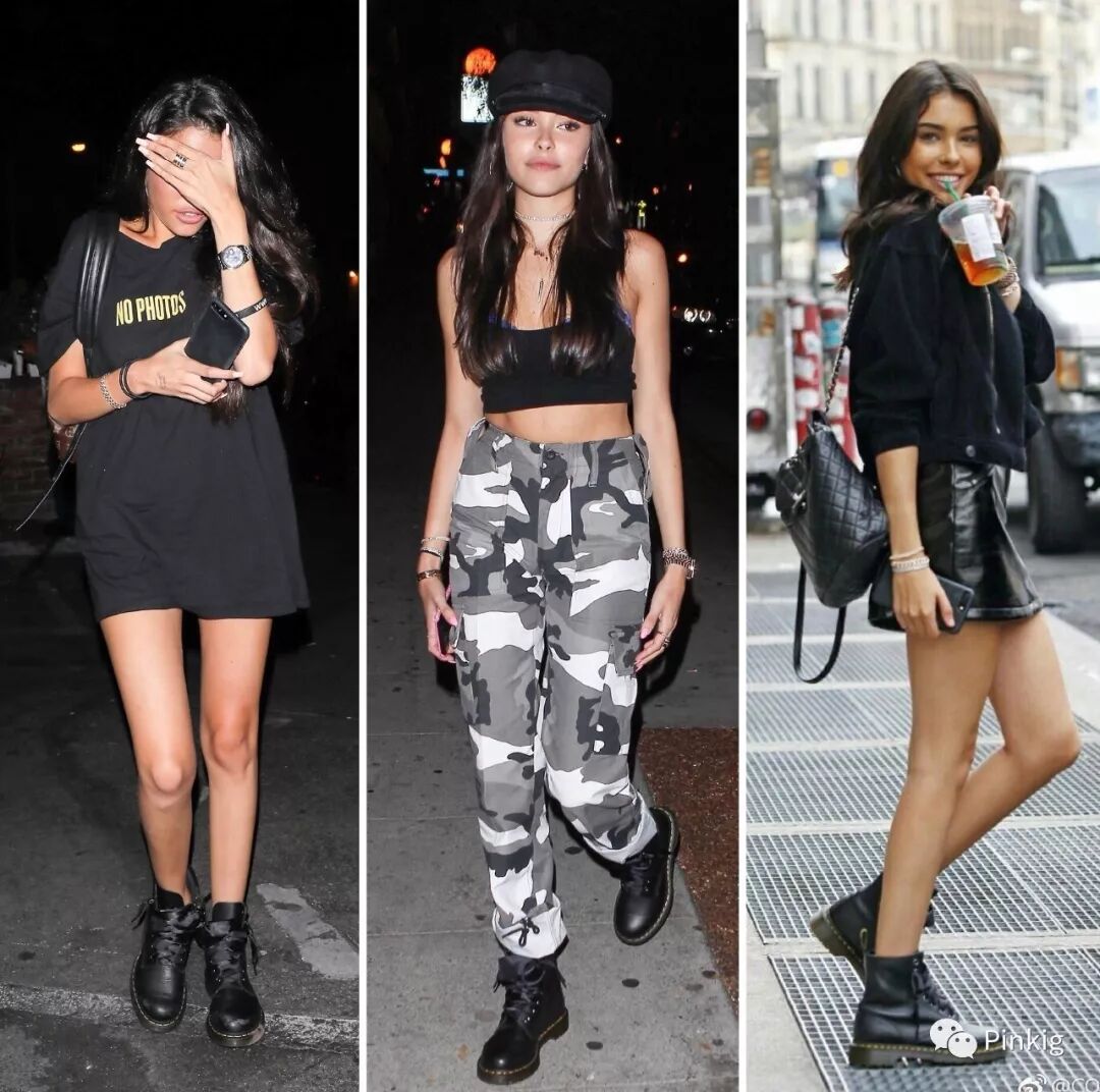 19岁的美国女歌手“啤酒妹”Madison Beer,出街穿Dr Martens也是别有一番韵味,摇滚风十足。(偶尔换换鞋带,又是新风格)