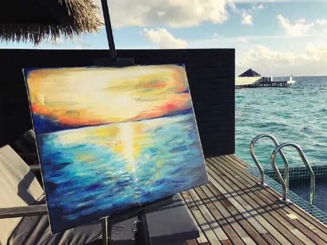 为了学习油画,张馨予还特地到欧洲拜师,专心练习了大半年。可以说,这趟欧洲之旅,让张馨予的油画更上一层楼。张馨予的油画,最大的特点就是色彩的搭配和过渡,不仅多姿艳丽,而且过渡自然。比如上图,远处的天空和海洋的画面比例,张馨予的处理就十分大胆。另外,蓝色大海的颜料搭配,天空晚霞、落日的细节处理,不仅细腻而且层次感极强。可见,张馨予的油画已经不只局限于形似的境界,她已经达到一种意境的追求。难怪网友会如此大赞:“人美画更美!”