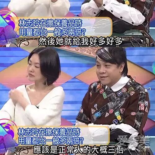 节目中,蔡康永突然发问林志玲是不是常常用很过量的护肤品,小S也说在后台的时候问她要一点护手霜,结果林志玲给了她超级多的量,大概是常人用量的三倍!而林志玲也萌萌承认说自己超级喜欢过量使用,尤其是护手霜之类的产品,甚至有出现因为擦涂太多护手霜而遭受握手另一方的嫌弃。