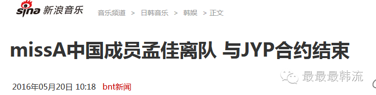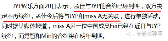 言归正传,今天最重磅的消息已经出炉:miss A的成员孟佳已经和JYP解除合约,脱离组合单独发展↓