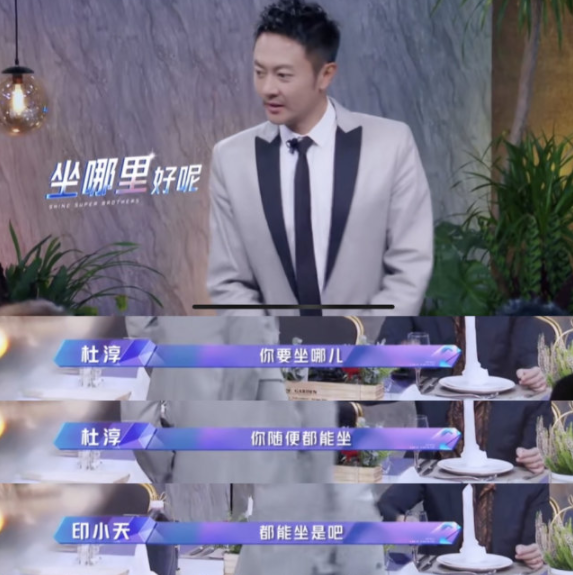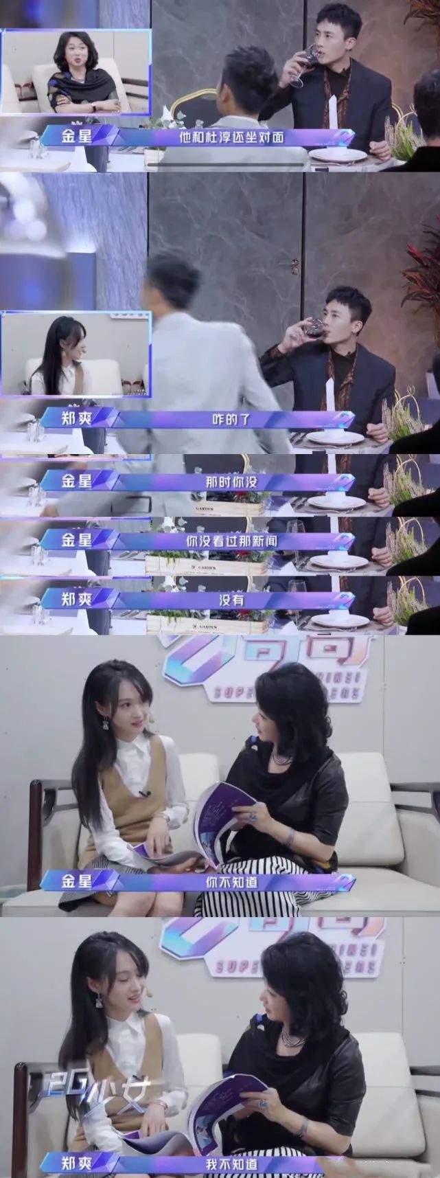 金星吐槽了一句“他(印小天)和杜淳还坐对面”。郑爽不知道“插刀教”,问“咋的了?”因为哥哥正在源源不断地进入,所以金星不好现场科普,表示慢慢录节目你就全知道了。