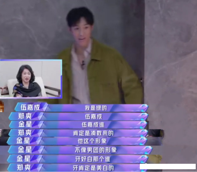 伍嘉成刚进来的时候还怀疑自己进错房间,大家都是西装革履,自己是绿的。郑爽直接下定论:肯定是凑数来的,牙肯定是美白的。金星也表示:他这个形象,不像男团的形象。