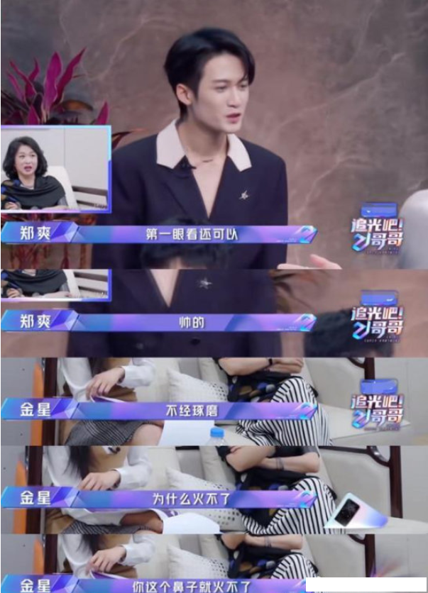 檀健次,颜党郑爽表示第一眼看还可以,帅的,但金星表示不经琢磨(经不起琢磨),说:“为什么火不了,你这个鼻子就火不了,你这个眼角就火不了。”