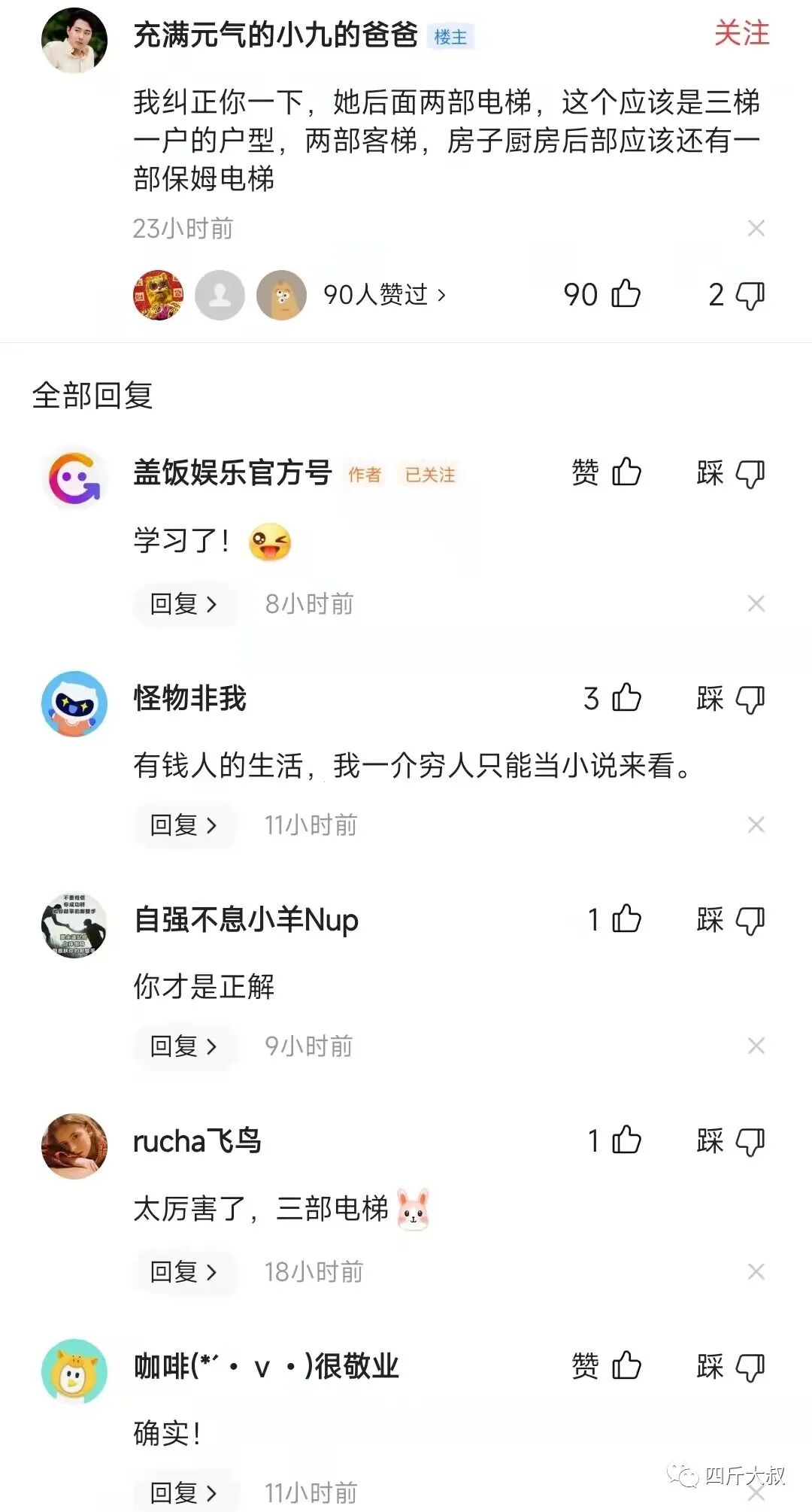 而根据知情网友透露,苗苗这样的房子,不是一梯一户,也不是两梯一户,而是三梯一户,视频里的外面出现了两部电梯,是客人用的,而房子的厨房后面,应该还有一部保姆的电梯,这是何等地豪华和私密啊!