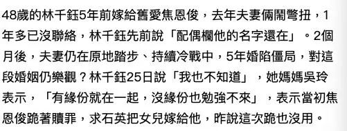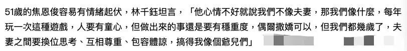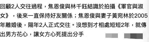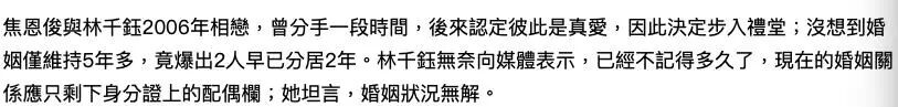 焦恩俊二婚妻子承认婚变传闻,两人已分居2年,男方恋爱期曾劈腿 最新电影资源平台分享 港台男星 2020-04-14 10:00:14 872 创作不易,用心坚持,欢迎请BaGua喝几杯爱心咖啡!打赏并支持本文 打赏并删除本文 古装男神焦恩俊和二婚妻子林千钰的6年婚姻生活这次是真的要画上句号了?4月12日。据台媒报道,曾经屡次和焦恩俊传出婚变的林千钰,终于承认自己已经与焦恩俊分居两年,如今两人只剩下身份证上的配偶关系,婚姻状况无解。林千钰的这番言论算是彻底坐实了此前的婚变传闻,焦恩俊独自住在嘉义,林千钰住在台北,曾经的旧情人最终还没能携手走到最后。其早在18年,就有媒体爆料焦恩俊和林千钰两人的婚姻已经亮起了红灯。17年5月20日那天,林千钰晒出了自己的性感写真,那时候焦恩俊还在底下评论“哎呦,又变美了,520”,甜蜜表白羡煞旁人。19年7月焦恩俊和林千钰被曝出正处于冷战阶段,林千钰社交平台上已经看不到任何焦恩俊的相关信息,焦恩俊也在各个社交平台上取关了林千钰以及林千钰的爸妈。对于焦恩俊的行为,林千钰也只是无奈表示“他可能是更年期到了,要看他更多久,我不去设想这么多,顺其自然,大家都是成熟人”同时否认了两人之间有第三者。当被问到对这段婚姻是否仍旧乐观时,林千钰用“我不知道”四个字回应,林千钰的妈妈则表示“有缘分就在一起,没缘分也勉强不来。”焦恩俊的女儿焦曼婷对于父亲的婚姻问题,也坦言“他自己的事自己解决,但不管做什么决定,我都支持他,毕竟真正相处的是他们。”那时候的林千钰、林千钰妈妈以及焦恩俊女儿,只言片语中似乎默认两人的婚姻已经开始岌岌可危了。焦恩俊和林千钰的这段婚姻,一开始也颇具戏剧性。1990年,焦恩俊出演电视剧《莫道无情》而进入娱乐圈,92年焦恩俊在拍摄《军官与淑女》时与林千钰而相知,焦恩局饰演海军直升机大队中尉,林千钰饰演女青年工作大队分队长。焦恩俊林千钰但两人当时并未擦出火花,焦恩俊于1994年和黄宛林结婚,并生有两个女儿。焦恩俊在结婚10年后结束了和黄宛林的婚姻关系,焦恩俊净身出户,独自抚养两个女儿。那时候的林千钰成为焦恩俊的心灵寄托,两人无话不谈,最终在2006年成为了情侣。但这段恋情仅仅持续了2年就结束了,原因很简单,因为焦恩俊劈腿了,之后林千钰又结交了一个新男友。本以为不会再有交集的两人因为一场旅行破镜重圆。林千钰去加拿大旅游时,遇到了5年没有联系的旧爱焦恩俊。在焦恩俊的热情攻势下,林千钰再次沦陷了,尽管曾经有劈腿阴影,但林千钰还是义无反顾嫁给了焦恩俊,焦恩俊也向林千钰妈妈下跪后,才抱得美人归。2014年9月6日,46岁的焦恩俊正式迎娶了44岁的旧爱林千钰。然而婚后的生活并没有想象中美好,每次焦恩俊心情不好的时候就会抱怨自己和林千钰不像夫妻,林千钰却劝焦恩俊少玩这种把戏,夫妻之间应该互相体谅。很显然这段曾经有过沙子的婚姻并没有走到最后,焦恩俊和林千钰现在已经貌合神离。焦恩俊和林千钰这段旧情复燃的经历也和周慧敏、倪震极其相似,而倪震也在几天前被曝出和陌生年轻女子卿卿我我。不管怎么说,还是希望焦恩俊和林千钰都能早日走出这段婚姻,有问题早日说开吧。你点的每个赞,我都认真当成了喜欢 创作不易,用心坚持,欢迎请BaGua喝几杯爱心咖啡!打赏并支持本文 打赏并删除本文 感谢您的支持鼓励,我会继续努力的!文章地址:用户邮箱:打赏金额:USDT 请输入数字点击”去打赏“,即可进行打赏支持本文章哦 焦恩俊 About the Author 最新电影资源平台分享 功能介绍:大家一起追剧看电影~资源每天都有更新哦!!备用号(橙子酱君) Related Posts 焦恩俊二婚妻子承认婚变传闻,两人已分居2年,男方恋爱期曾劈腿 2020-04-14 10:00:14 曾轶可大闹机场后,在伦敦街头唱《我和我的祖国》却被质疑洗白? 2019-10-04 10:00:52 发表评论
