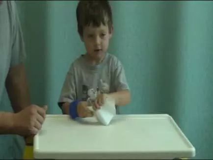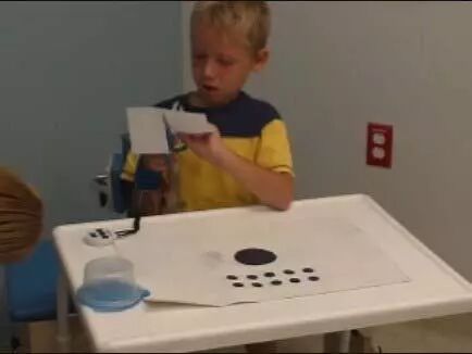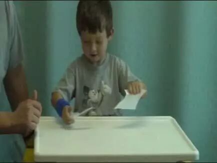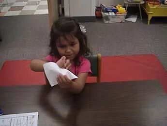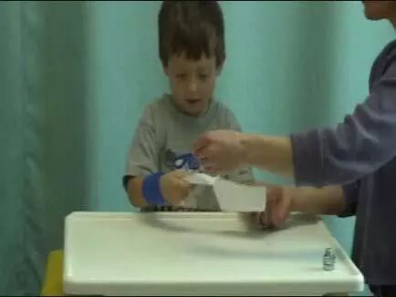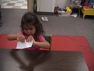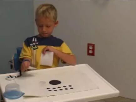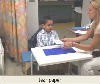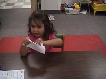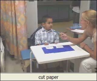 孩子坐在桌边。将一张 10×15cm 的纸和一把鈍头剪刀放在孩子面前的桌子上,物品放于中线位。