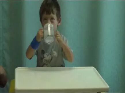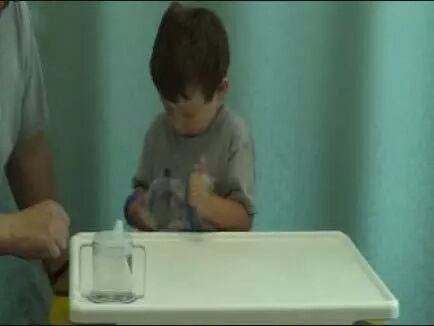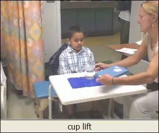 指示孩子拿起杯并送至嘴中。杯子放在中线位,孩子可以先移动然后再举起杯子。