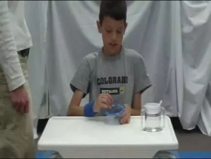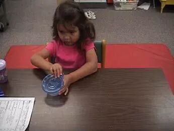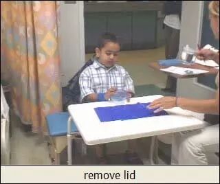 指示孩子打开密封容器的盖子。如果孩子使用双腿来稳定坐姿,再次指示他们不要使用双腿。如果他/她依然使用双腿,应记录在临床报告单上。