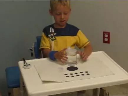 孩子坐在椅子中。将装满 250ml 水的标准测试杯放在孩子面前的桌上,杯子放在中线位。