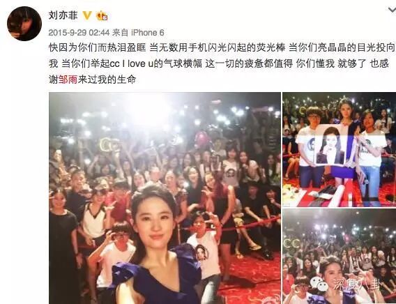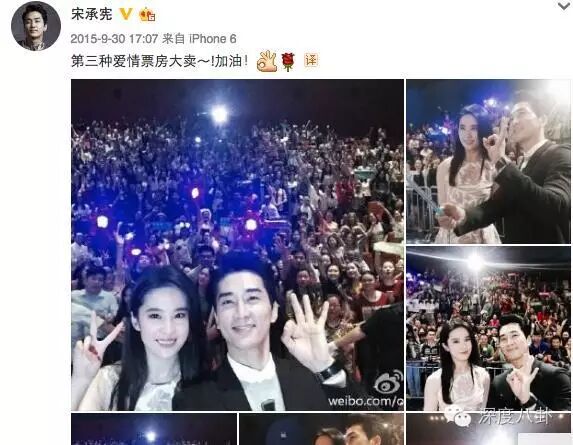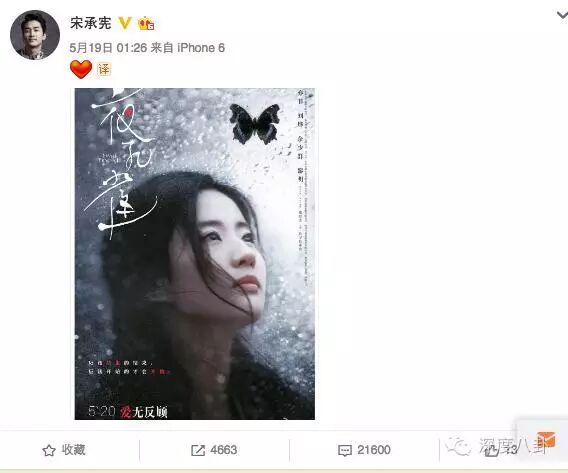 特别是今年5月份刘亦菲在出席《夜孔雀》发布会时被问及是否知道男友在上海,刘亦菲只是笑笑没有回应。而宋承宪则是连忙晒出刘亦菲的电影宣传照,附上了“爱心”。而刘亦菲的微博, 最近一次提到宋承宪都还是去年宣传电影的时候。相比宋承宪晒个电影院的宣传照都要带上刘亦菲,我们的神仙姐姐晒出的照片则都是单人的,完全看不到宋欧巴的影子。