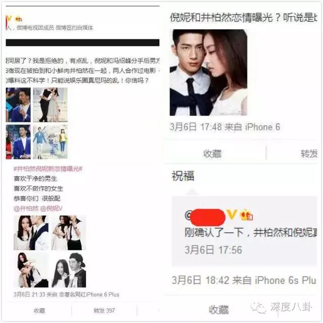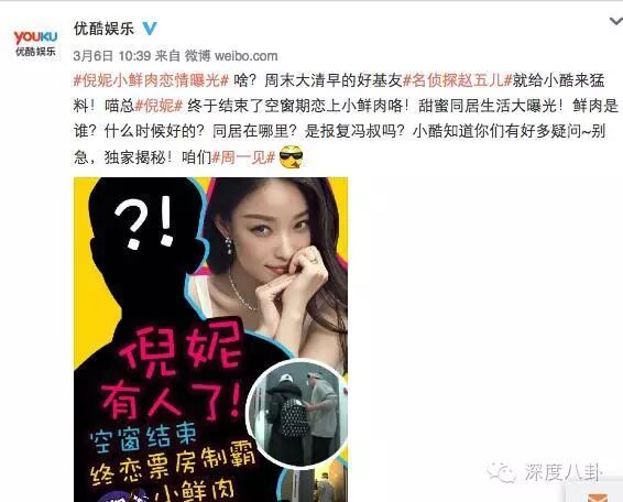 先是3月6号大周日的上午,优酷娱乐发了条预告微博,称倪妮结束空窗期恋上了小鲜肉,还已经同居了,但并未说明是谁,末了又是熟悉的“周一见”。然而没过多久就有营销大号曝光这个小鲜肉就是井柏然, 接着各大营销号便纷纷发力,不仅统一带上“井柏然倪妮新恋情曝光”的话题,连用的照片都很相似。而且态度也是空前的一致,祝福祝福再祝福。