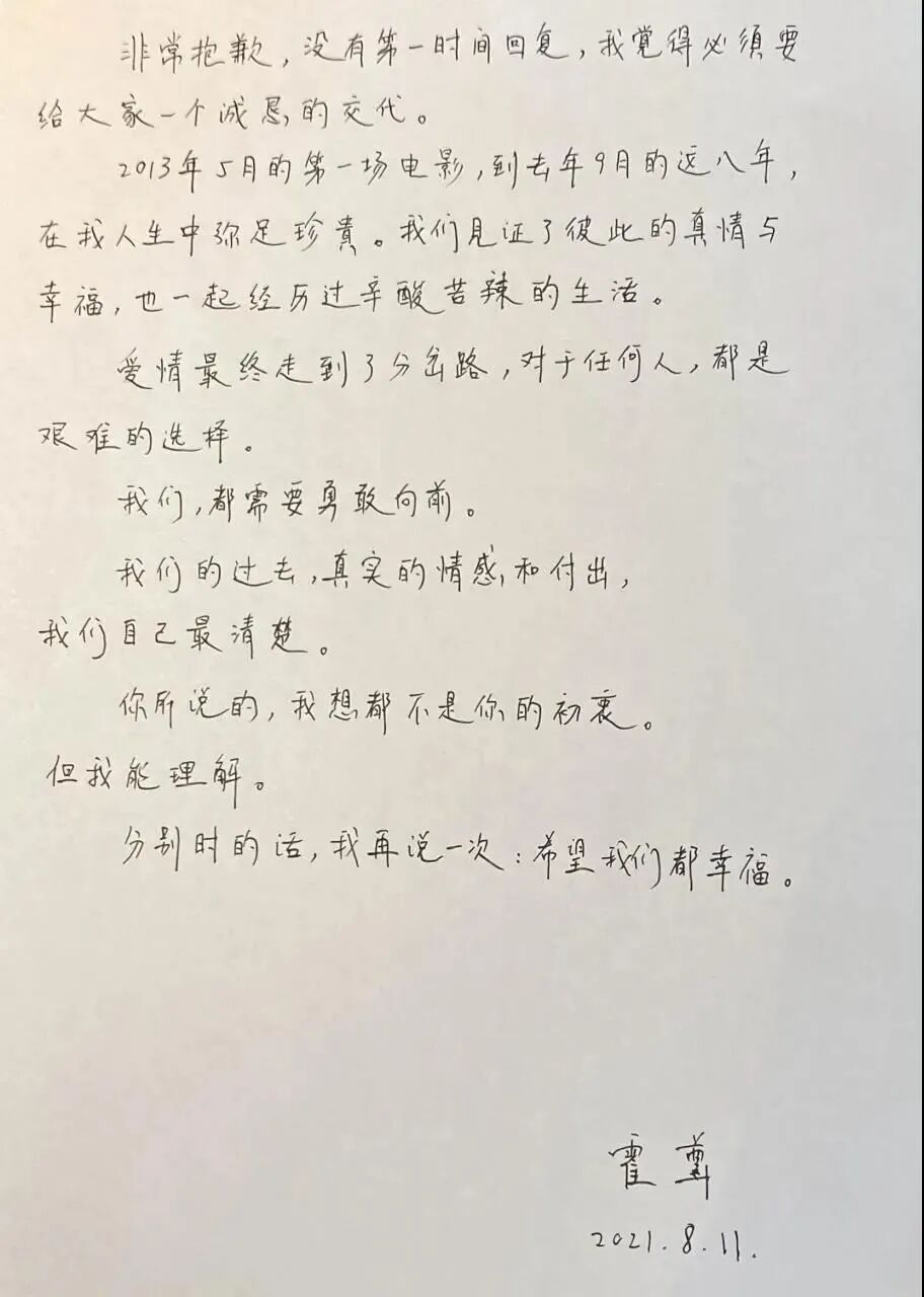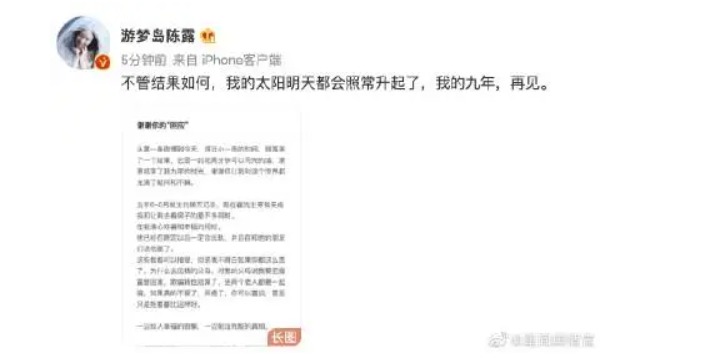 在霍尊回应后,陈露发了一篇微博,称正式告别自己九年的恋情。