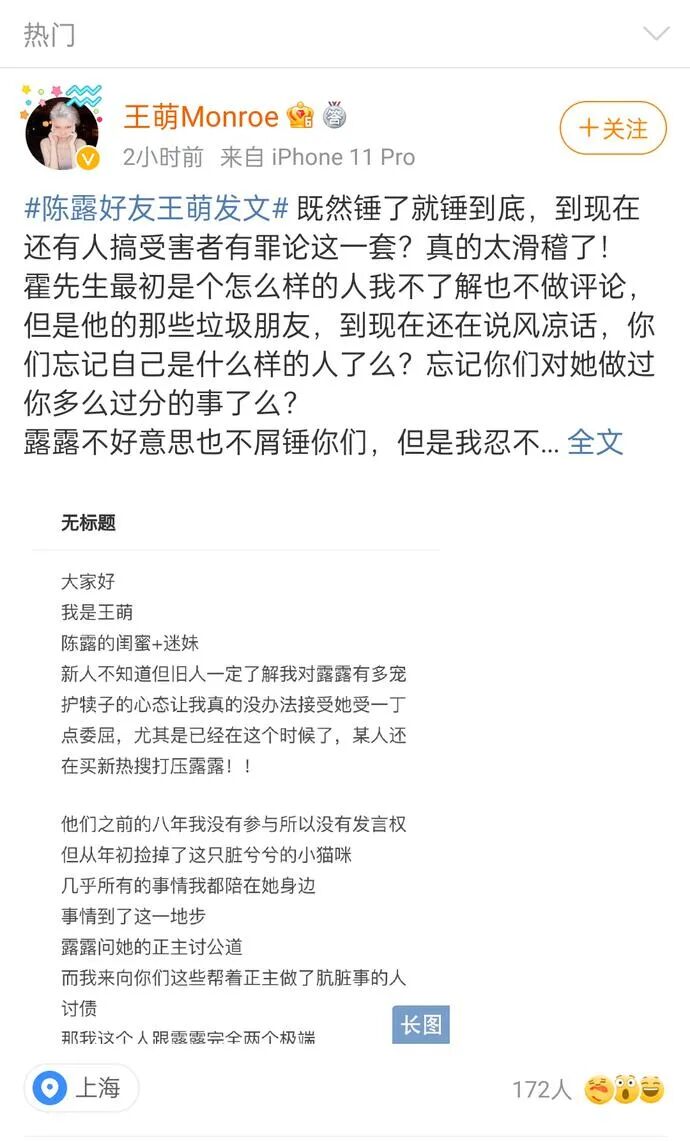 在陈露好友王萌的长文里,就详细描述了霍尊的“普法”行为。