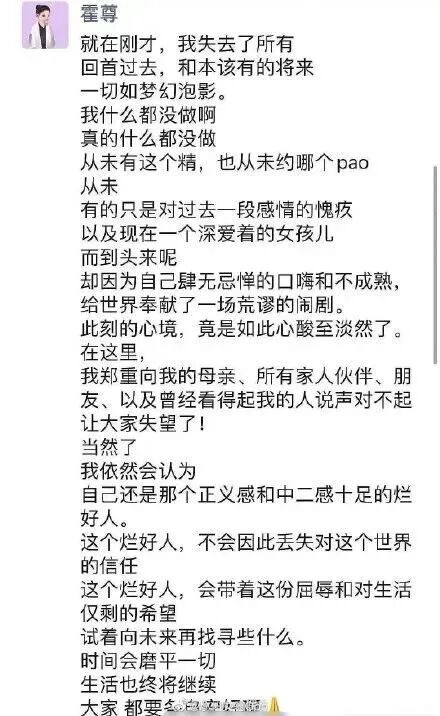 而在被点名之后,一段疑似霍尊朋友圈的文字流传到了网上。