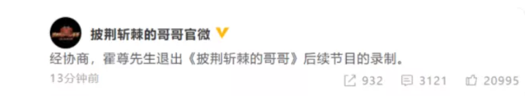 《披荆斩棘的哥哥》节目组官微发文宣布:“经协商,霍尊先生退出《披荆斩棘的哥哥》后续节目的录制。”