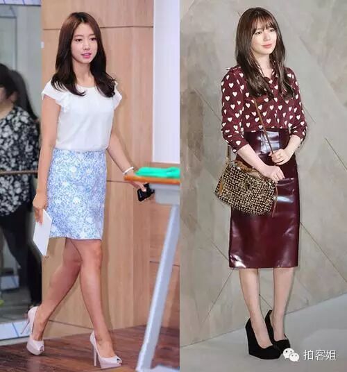 同样是铅笔裙,一个是白衬衫搭配浅蓝色印花铅笔裙,一个是酒红色印花衬衫搭配漆皮铅笔裙,整体朴信惠更为清新亮眼,酒红色与黑色还有金色挎包的搭配,让尹恩惠略显老。