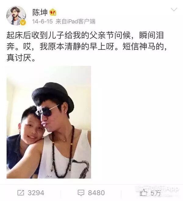 孩子大了些以后,他也终于压抑不住自己心里的欲望,加入了炫娃大军。从这两年他发的微博来看,父子关系相当之好,坤儿对孩子的爱可谓一滴不落。