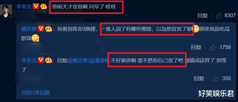 我们可以看到,李荣浩也是第一时间就老婆的动态下留言,称:他明天才官宣啊,问早了,哎呀。而杨丞琳则回复:我看到青你3热搜,一堆人说了有哪些导师,以為他官宣了耶,原來我是吃瓜群众。