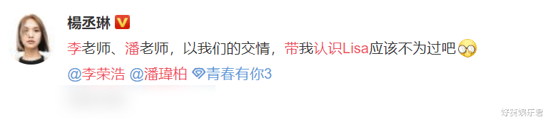 于是乎杨丞琳便直接在社交软件上艾特李荣浩,并且表示以我们的交情,带我认识Lisa不为过吧?不得不说李荣浩杨丞琳这对夫妻真的非常逗趣和可爱没错了,只不过为何杨丞琳还艾特上了潘玮柏呢?