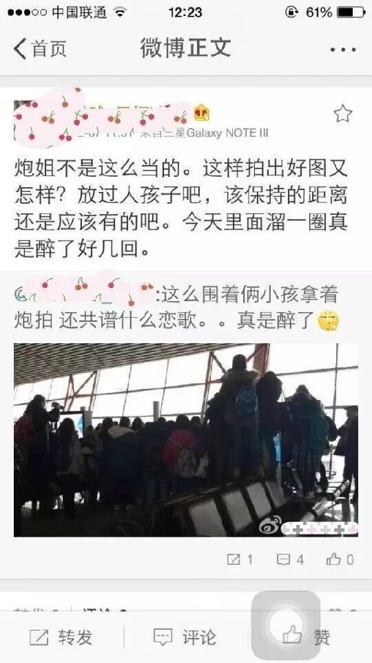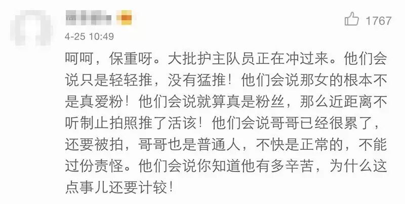 言论大致就是这个女孩子拍照离得太近了耶,手机都贴在欧巴脸上(?)了耶,一点都不尊重欧巴耶,没礼貌耶,还威胁到欧巴的安全耶,被推开很正常耶。