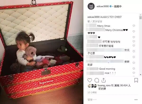 12月25日的圣诞节目,冠希也不忘记把自己的最爱拿出来炫耀一把。并且这一次他自己也出镜了,在媒体上晒出了关于自己女儿的一些照片。其实一张就是女儿的玩具箱吸引住了大家的视线,并且被指出冠希哥这是在炫富啊!