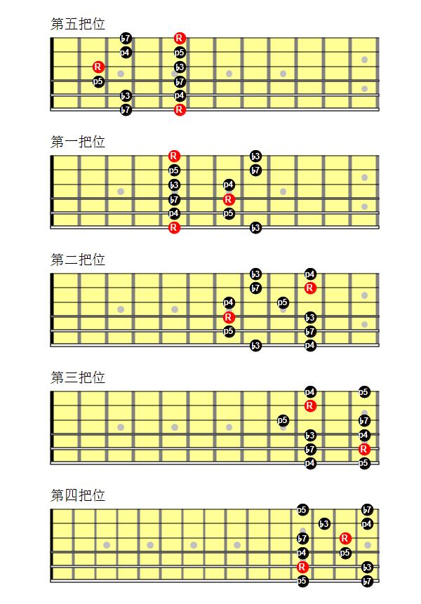 前提是:我们需要对五声音阶整个指板上的指法了如指掌。五声音阶在吉他指板上分为五个把位,分别为: