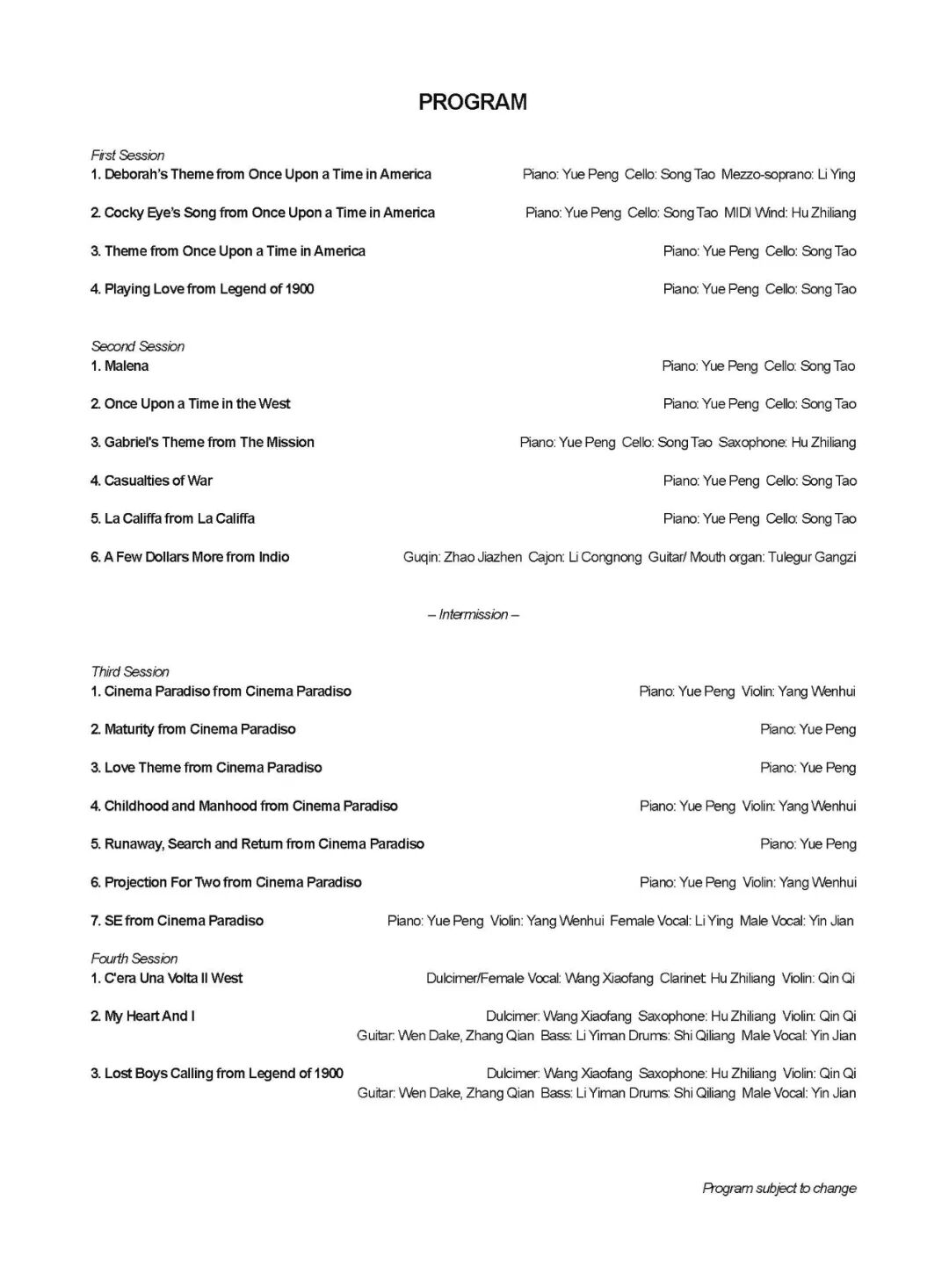 在埃尼奥·莫里康内,这位以100多部电影经典作品的精彩配乐而闻名世界各地并深受观众喜爱的意大利伟大作曲家去世一年后,意大利驻华大使馆、意大利驻华使馆文化中心和中山音乐堂合作举办一场由民间音乐、世界音乐、摇滚、爵士乐、印地音乐等中国当代最具影响力的音乐家参加的纪念音乐会。