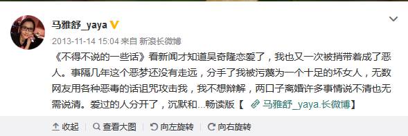 吃瓜群众都在拼命地去为人家的离婚辩护谁对谁错,反而两位当事人都低调地很,没有做过什么回应。直到吴奇隆和刘诗诗在一起后,马雅舒才在微博上公开声明了当年的一些不实传闻。