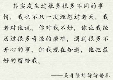 从吴奇隆在婚礼上说的独白看来,正是由于失去过,所以才会愈加珍惜吧。现在吴奇隆对刘诗诗那么宠也是很正常的。为他们早日生一堆“小隆包”点ZAN,一堆,ZAN!